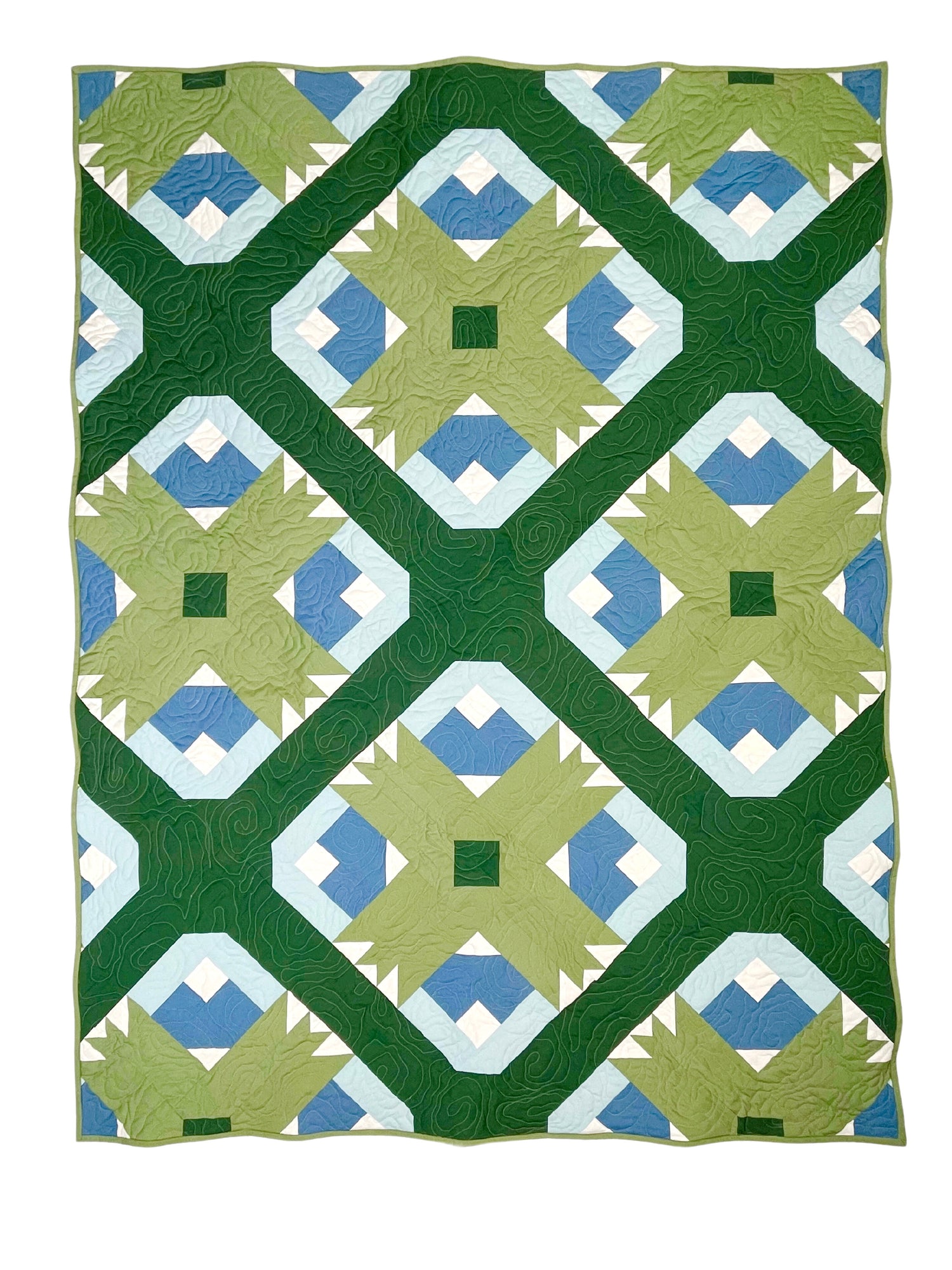 This pattern is inspired by the beautiful Wasatch Mountains of Utah, where I call home. You’ll see snow-capped mountains surrounded by snow and trees in this pattern. If you shift your vision, you’ll also see a wildflower bud. The contemporary version is a fun rotation of blocks that gives it a whole new look.